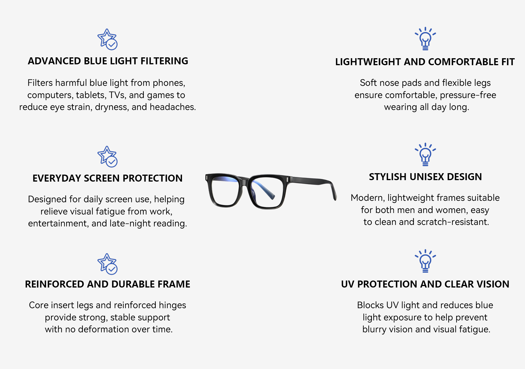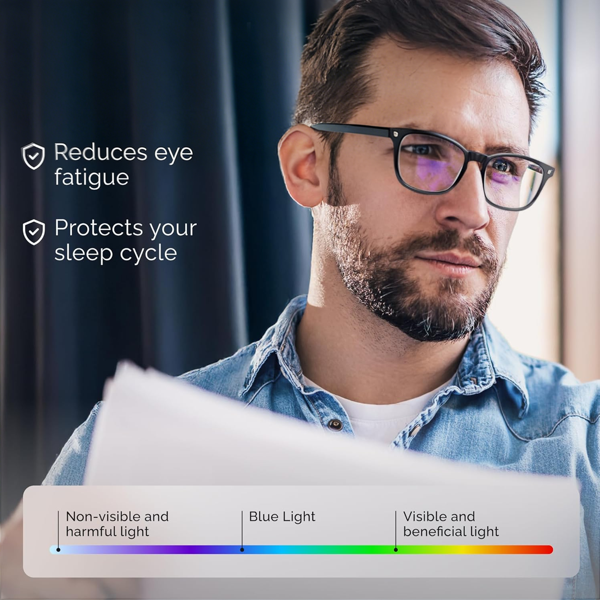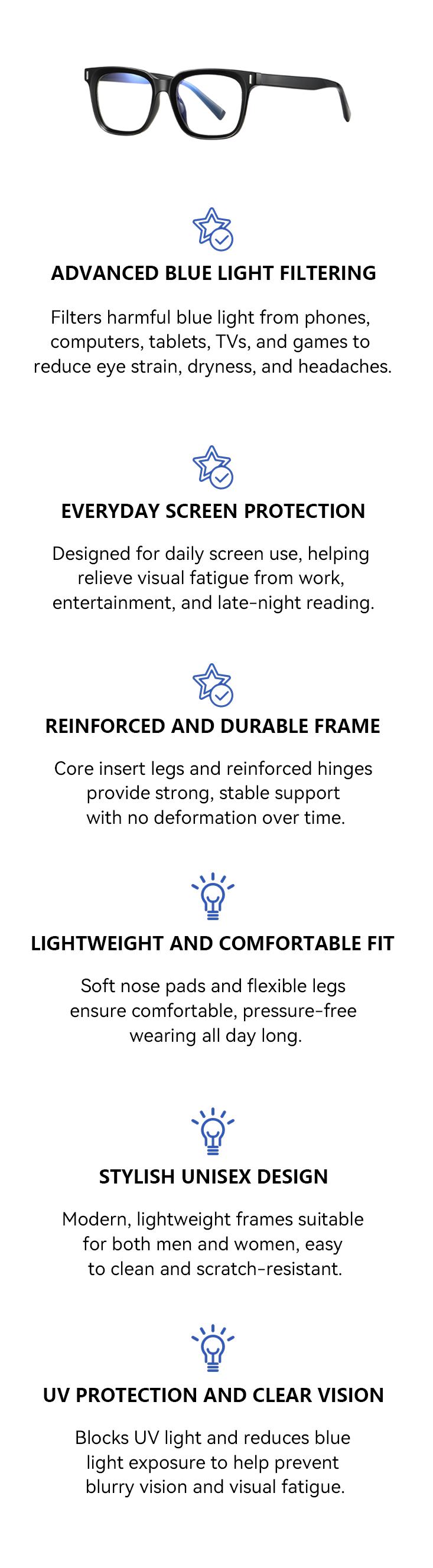 Effectively blocks harmful blue light and UV rays to help protect your eyes from digital screens and outdoor exposure, while the lightweight design ensures comfortable, all-day wear without pressure or fatigue.
