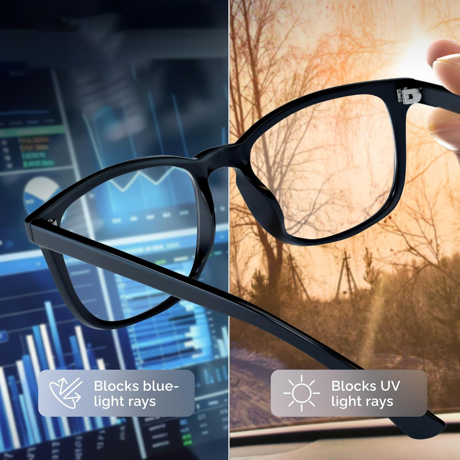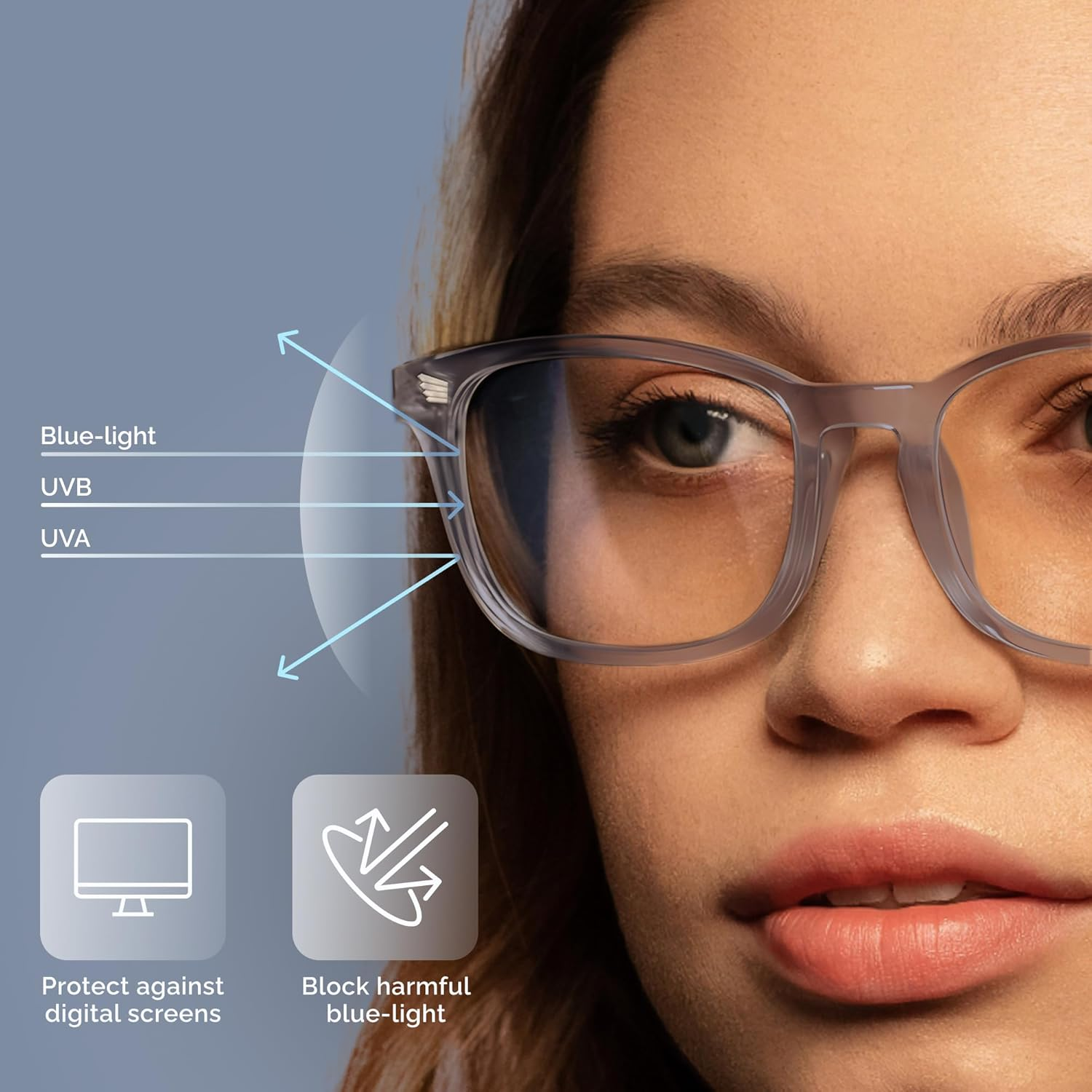Filters harmful blue light from digital screens while blocking UVA and UVB rays, helping protect your eyes from daily screen exposure and reducing visual strain for clearer, more comfortable viewing.